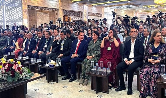 Konferansa DEM Partili Milletvekilleri Serhat Eren, Saliha Aydeniz, Gülcan Kaçmaz, Mehmet Kamaç ile Demokratik Bölgeler Partisi (DBP) Eş Genel Başkanı Keskin Bayındır da katıldı. DEM Parti heyetinin, ana omurgasını PKK-YPG’li teröristlerin oluşturduğu sözde Suriye Demokratik Güçleri (SDG) elebaşı Ferhat Abdi Şahin ile yan yana görüntü vermeleri dikkat çekti.