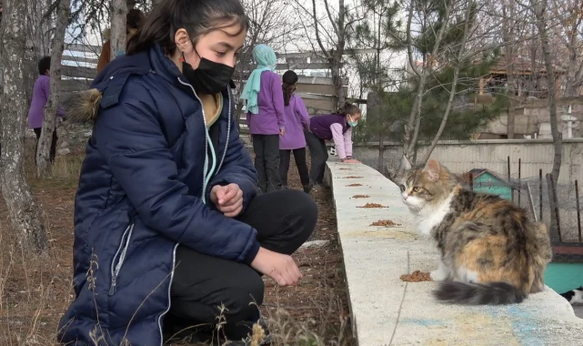 Çankırı'da 100 çocuğun eğitim gördüğü 30 Ağustos Ortaokulunda, pandemi sürecinden önce yürütülen "Hayvan Dostu Okul" projesi kapsamında sahiplenilen kediler, öğrencilere hayvan sevgisini aşılıyor. "Hayvan Dostu Okul" projesinin sonlanması sonrasında, okuldaki kedilerin bakımına devam edildi. Öğrenci ve öğretmenlerin sahiplendiği 6 kedi, kısa sürede okulun maskotu haline geldi. Okul bahçesinde yapılan kulübelerde soğuktan korunan kediler, öğrenci ve öğretmenler tarafından besleniliyor. Kedilere düzenli olarak mama ve su veren öğrenciler, ders aralarında ise soluğu bahçedeki kedilerin yanında alıyor. Öğrenciler, kedileri sevmek için adeta birbirileriyle yarışıyor. Öğrencilere hayvan sevgisini kazandıran kedilerin, bakım ve mama masrafları ise okul personeli tarafından karşılanıyor.
