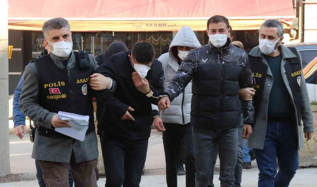 Eskişehir'de bir büfeden hırsızlık yaptıkları belirlenen 5 şahıstan 4'ü tutuklandı. Şüphelilerden birinin adliyeye götürülürken yüzünü maskeyle kapatmaya çalışması dikkat çekti.