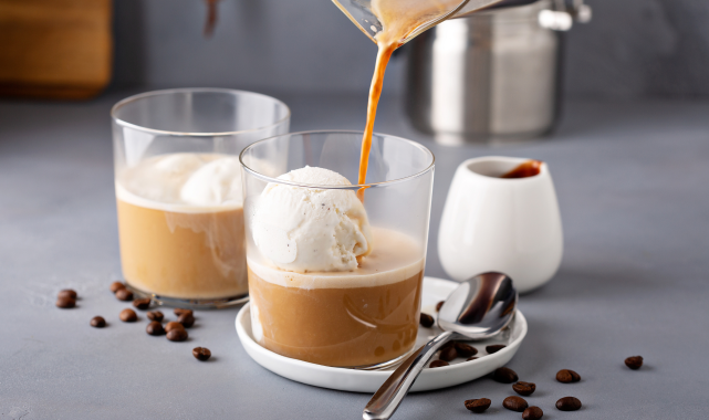3. Demlenen ve bardakların içerisine damlayan espressoyu alın. Henüz sıcakken içerisine birer top vanilyalı dondurma koyun.