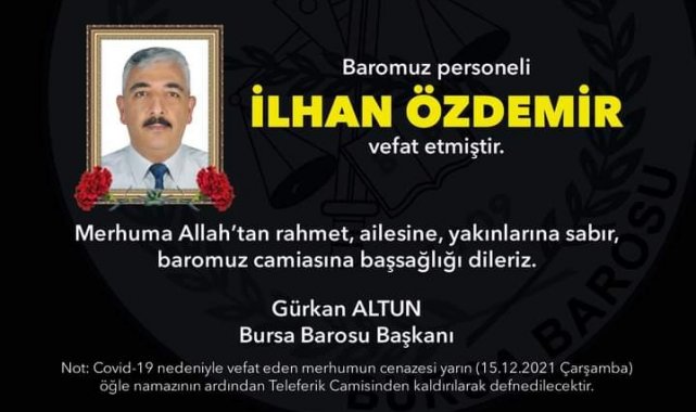 Bursa Barosunda uzun yıllardır görev yapan 54 yaşındaki İlhan Özdemir 14 gün önce yakalandığı koronavirüs sebebiyle öldü. Özdemir'in ölümü Bursa Barosunda şoka sebep olurken sevenlerini yasa boğdu. Özdemir'in cenazesi bugün öğleyin Teleferik Camii'nde kılınacak cenaze namazının ardından toprağa verilecek.