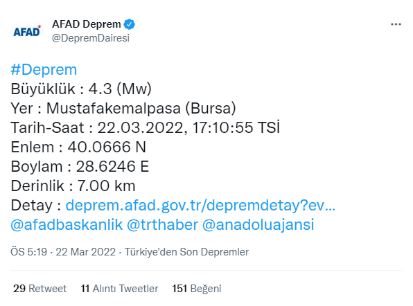 AFAD verilerine göre, saat 17:10 'da merkez üssü Bursa’nın Mustafakemalpaşa ilçesi Körekem mevkiinde 4.3 büyüklüğünde, yerin 7 kilometre derinliğinde bir deprem meydana geldi.