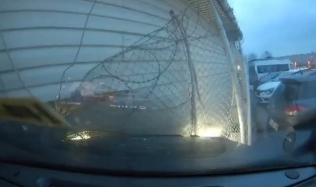 Bursa'da yağışlı havada kontrolden çıkan lüks cip bariyerleri aşarak fabrika otoparkındaki konteynerde çarparak durabildi. O anlar araç kamerasına anbean yansıdı.