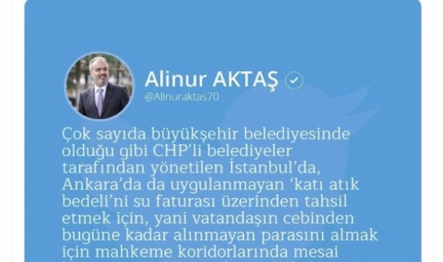 "Çok sayıda büyükşehir belediyesinde olduğu gibi CHP'li belediyeler tarafından yönetilen İstanbul ve Ankara'da uygulanmayan katı atık bedelini su faturası üzerinden tahsil etmek için, yani vatandaşın cebinden bugüne kadar alınmayan parasını almak için mahkeme koridorlarında mesai harcayan CHP'li Mudanya Belediyesi daha açık konuşsun. Hukuk zaferinin kazananı vatandaş mı? Kaybedeni kim? Diğer şehirlerde alınmayan bu bedelin vatandaşlarımdan da alınmaması adına ne gerekirse yapacağız" dedi.