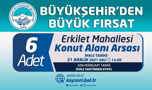 Mülkiyeti Kayseri Büyükşehir Belediyesi'ne ait olan, Kocasinan ilçesi Erkilet Mahallesi'nde bulunan 6 adet konut alanı arsası, 2886 sayılı Devlet İhale Kanunu'nun 37. maddesi gereğince yapılan "Kapalı Teklif Usulü" ihale ile ayrı ayrı satılacak.