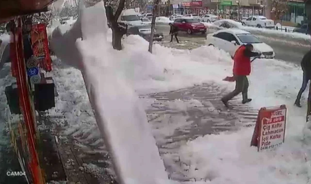 Muş'ta iş yerinin önünde biriken karları temizleyen esnaf 6 katlı binanın çatısından kopan dev buz kütlesinin altında kalmaktan son anda kurtulurken, yaşananlar güvenlik kamerasına yansıdı.