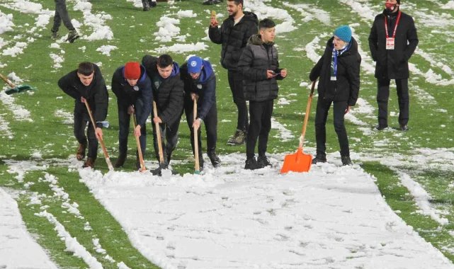 Saha zeminin müsabaka saatine kadar temizlenmesi için çabalayan stadyum görevlileri, yeni bir kar yağışı için de hazırlıklı olarak bekliyor.