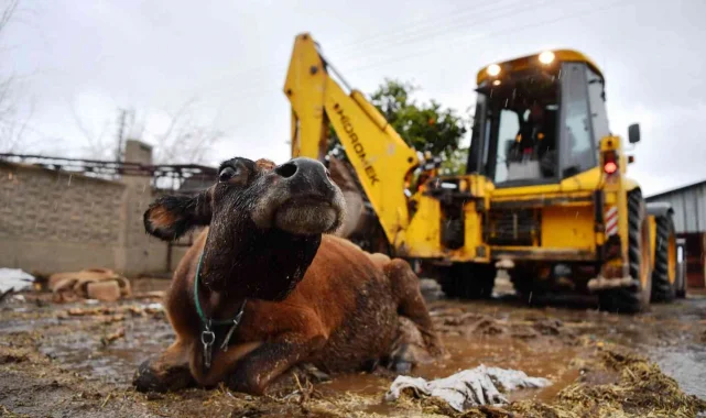 Konyaaltı ilçesine bağlı Kır Mahallesi'nde Mustafa Ayhan'a ait inek, bahçede otlarken aniden rahatsızlanarak yere çöktü. Ayhan ailesinin 'Yumak' adını verdiği inek, sahipleri tarafından bulunduğu yerden bir türlü kaldırılamadı. İneği kaldırma çabası 3'üncü günde de başarısız olunca aile, Konyaaltı Belediyesi Halk Masa aracılığıyla ineği kurtarmak için yardım istedi. Veterinerlik Müdürlüğü ekipleri haber alır almaz Yumak adlı ineği kurtarmak için çalışma başlattı. Yağmurlu havada yaklaşık iki saat süren çalışmanın ardından inek, halatla bağlanıp, kepçe yardımıyla ahıra alındı. Çalışma süresince Yumak'ın yavrusu da bir an olsun annesinin yanından ayrılmadı.