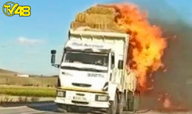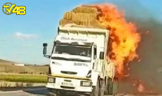 Çorum'da saman balyalarını taşıyan kamyon seyir halinde giderken alevlere teslim oldu.