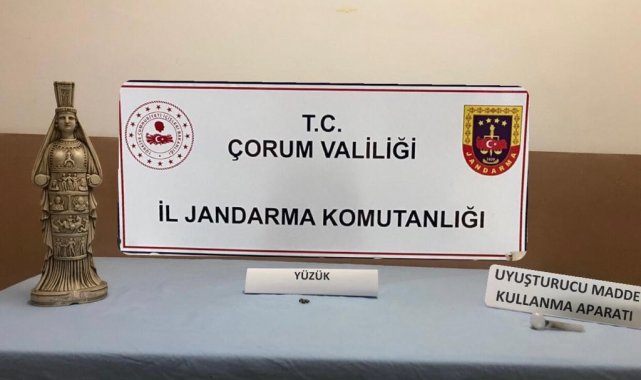 Edinilen bilgiye göre, Çorum İl Jandarma Komutanlığına bağlı ekipler, Alaca ilçesinde ikamet eden bir şahısta tarihi eser bulunduğu ve bunları satmaya çalıştığı bilgisine ulaştı. Düzenlenen operasyonda şüpheli şahsın evinde yapılan aramada, tarihi niteliği olduğu değerlendirilen 1 adet altın yüzük, 1 adet mermer heykel ile 1 adet uyuşturucu içiminde kullanılan aparat (payp) ele geçirildi.