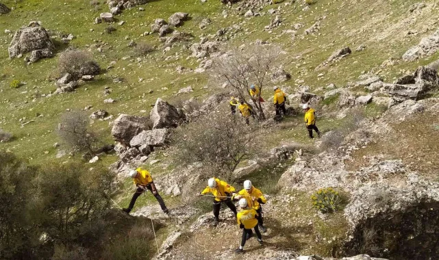 Denizli'de Dağ Arama Kurtarma (DAK) ekibinde yer alan 11 gönüllü, Pamukkale ilçesinde bulunan kayalık bölgede doğal afetlere karşı 7 saat iple eğitim aldı.