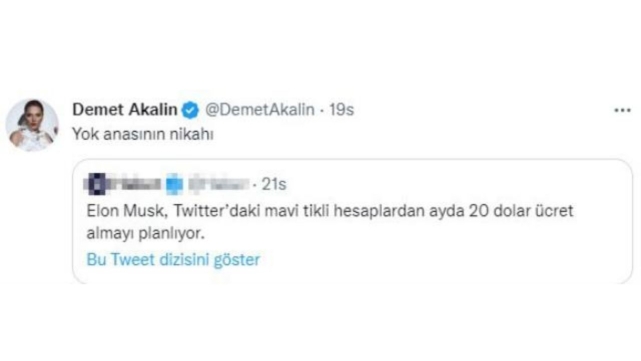 Musk’ın planına göre Twitter'da abonelik ücreti olacak. Mavi tik edinmek için de abone olmak şart koşulacak. Şu an mavi tiki olan kullanıcılarsa, mavi tikini kaybetmemek için 90 gün içinde abonelik sistemini satın almaları gerekecek. Twitter’daki mavi tikli hesaplardan ücret alınacağı haberi yayılınca şarkıcı Demet Akalın’ın tepkisi gecikmedi. Akalın, sosyal medya hesabından isyan ederek “Yok anasının nikâhı” dedi.