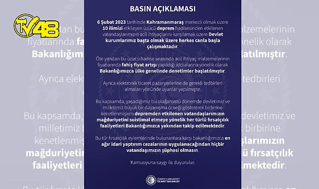 Bakanlık açıklamasında, "Deprem sırasında acil ihtiyaç malzemelerinin fiyatlarında fahiş fiyat artışı yapıldığı iddialarına yönelik olarak Bakanlığımızca ülke genelinde denetimler başlatılmıştır. Bu tür fırsatçılık eylemlerinde bulunanlara karşı bakanlığımızca en ağır idari yaptırım cezalarının uygulanacağından hiçbir vatandaşımızın şüphesi olmasın" denildi.