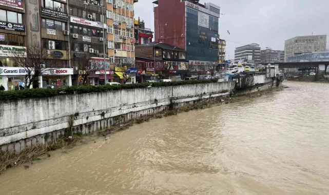 Zonguldak'ta iki gündür devam eden sağanak yağış nedeniyle kent merkezinde ki derelerin rengi sarıya döndü.