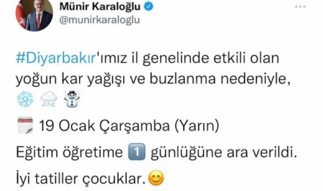 Konuya ilişkin Vali Münir Karaloğlu, sosyal medya hesabından yaptığı açıklamada, "Diyarbakır'ımız il genelinde etkili olan yoğun kar yağışı ve buzlanma nedeniyle 19 Ocak Çarşamba günü, eğitime bir gün süre ile ara verildi. Kamu kurum ve kuruluşları çalışanlarımızdan hamile, engelli, diyaliz hastaları ile kalp ve böbrek yetmezliği, kanser vb. kronik ağır hastalığı olan memur ve diğer kamu görevlilerimiz, 19 Ocak Çarşamba günü bir gün süre ile idari izinli sayılacaklar" ifadelerine yer verdi.