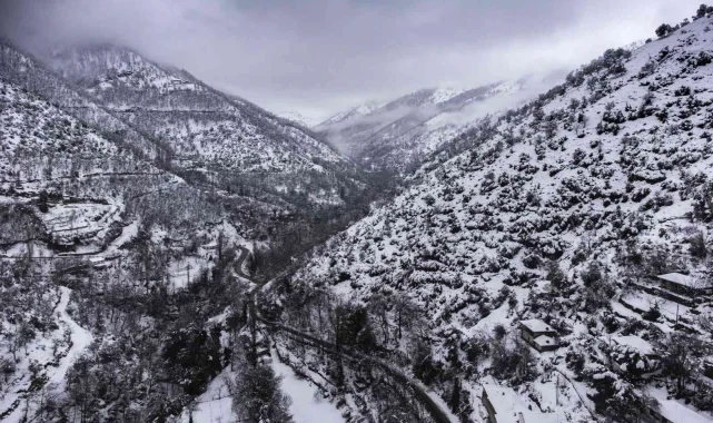 Denizli'de etkili olan kar yağışının ardından Babadağ Dağı ve Babadağ ilçesinde kartpostallık görüntüler oluştu. O anlar 120 metreden drone ile görüntülendi.