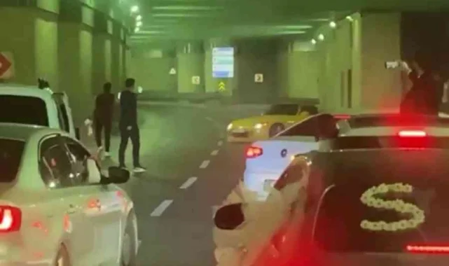 Esenyurt'ta bir grup düğün konvoyu yaparak alt geçidi trafiğe kapattı. Lüks araçların bulunduğu konvoyda bir kişi işe drift yaparak yürekleri ağza getirdi. Meşalelerin yakıldığı konvoyda damat da havaya atıldı. Trafikteki sürücülerin tepki gösterdiği olay cep telefonu kameralarına yansıdı.