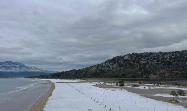 Muğla'nın Ortaca ilçesinde gece saatlerinde başlayan kar yağışı kısa süre etkili olurken, kar yağışı sonrası İztuzu Sahili beyaza büründü.
