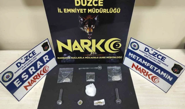 Düzce Emniyet Müdürlüğü Narkotik Suçlarla Mücadele Şube Müdürlüğü ekiplerinin Düzce Cumhuriyet Başsavcılığı koordinesinde yürüttükleri çalışmalar çerçevesinde, uyuşturucu madde taşıdıkları tespit edilen şüpheli 4 şahıs Düzce'ye giriş yaparken yakalandı. Yakalanan şahısların aracında yapılan aramalarda dört parça halinde toplam 56 gram metamfetamin, iki parça halinde toplam 1 gram esrar maddesi ve üç adet cam pipo ele geçirildi.