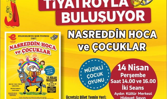 Efeler Belediye Başkanı Mehmet Fatih Atay'ın hayata geçmesine öncülük ettiği Efeler Belediyesi Şehir Tiyatrosu (EBŞT) kurulduğu günden bu yana gerçekleştirdiği sosyal sorumluluk çalışmaları ve sanat etkinlikleri ile kentin sanat hayatına renk katmaya devam ediyor. Efeler Belediyesi Şehir Tiyatrosu ekibinin hazırladığı 'Nasreddin Hoca ve Çocuklar' isimli müzikli çocuk oyunu, Aydın Kültür Merkezi Hidayet Sayın Sahnesi'nde 14 Nisan 2022 Perşembe günü saat 14.00 ve 16.00'da iki seans halinde sahnelenecek. Serkan Fırtına'nın yazıp yönettiği çocuk oyununun ücretsiz biletleri, Milli Aydın Bankası Kültür Merkezi ile Efeler Belediyesi Kültür ve Sosyal İşler Müdürlüğü'nden temin edilebilecek.