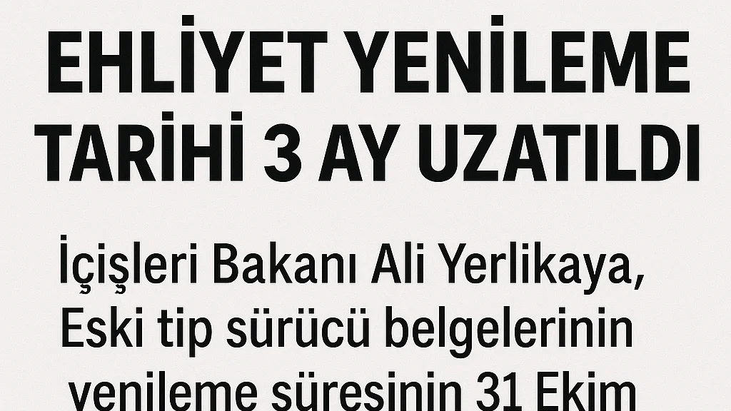 İçişleri Bakanı Ali Yerlikaya, eski tip sürücü belgelerinin yenileme süresinin üç ay daha uzatıldığını duyurdu. Buna göre, 31 Temmuz 2025’te sona ermesi beklenen yenileme işlemleri için son tarih 31 Ekim 2025 olarak belirlendi. Sürücülerin bu tarihe kadar randevu alarak belgelerini yenilemeleri gerekiyor.