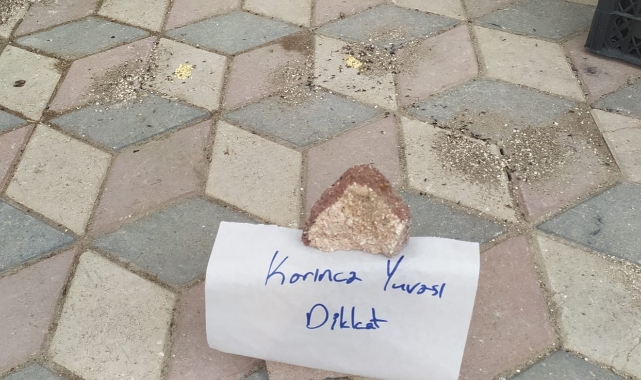 Cumhuriyet Mahallesi Sönmez Sokak'ta ismi öğrenilemeyen bir vatandaş sokak kenarında yuva yapan karıncalar ezilmesin diye 'Dikkat karınca yuvası' yazarak karıncaların fark edilmesini sağladı. Örnek bir davranışa imza atan vatandaş çevredekilerden takdir topladı.