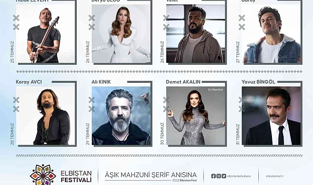 Büyük halk ozanı Aşık Mahzuni Şerif anısına düzenlenen Elbistan Festivali'ne katılacak sanatçıları açıklayan Elbistan Belediye Başkanı Mehmet Gürbüz,"Şehrimizin tanıtılması, şehrimizin üretim değerinin kalitesinin bütün dünyayla paylaşılması adına düzenlediğimiz Elbistan Festivallerinin üçüncüsünü 25 Temmuz'da hayata geçirmeyi planlıyoruz. Bu seneki festivalimizi Aşık Mahzuni Şerif anısına düzenleyeceğiz ve ustaya saygı diyoruz. Mahzuni Şerif'in memleketinde vefatından yaklaşık 20 yıl sonra onun anısına devasa büyük bir festivali hayata geçirmiş olmak bizim için de ayrıca mutluluk verici.Etkinlik takvimimiz netleşti. Sosyal kültürel sportif birçok alanda çok renkli etkinliklere ev sahipliği yapacağız. Birçok sanatçıyı Elbistan'da ağırlayacağız. İnşallah 25 Temmuz'da Haluk Levent ile açılış yapıyoruz. 26 Temmuz'da Velet ve Derya Uluğ'u ile hem rap hem de pop müzik alanında misafir edeceğiz. 27 Temmuz'da Buray'ı, 28 Temmuz'da Koray Avcı'yı, 29 Temmuz'da Ali Kınık'ı, 30 Temmuz'da Demet Akalın'ı ve 31 Temmuz'da Yavuz Bingöl'ü Elbistan'da ağırlamayı planlıyoruz. 24 Temmuz'da da inşallah Mustafa Ceceli konseri olacak. Mustafa Ceceli'nin de görüşmelerini yürütüyoruz" ifadelerini kullandı.