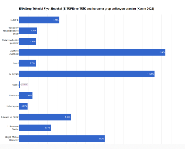 Ana harcama grupları itibarıyla 2022 yılı Kasım ayında bir önceki aya göre en az artış gösteren ana grup %-1,42 ile giyim ve ayakkabı oldu. Buna karşılık, 2022 yılı Kasım ayında bir önceki aya göre artışın en yüksek olduğu ana grup ise %5,75 ile gıda ve alkolsüz içecekler oldu.