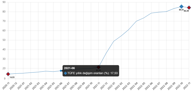 ÜFE'deki (2003=100) değişim 2022 yılı Kasım ayında bir önceki aya göre %2,88, bir önceki yılın Aralık ayına göre %62,35, bir önceki yılın aynı ayına göre %84,39 ve on iki aylık ortalamalara göre %70,36 olarak gerçekleşti.