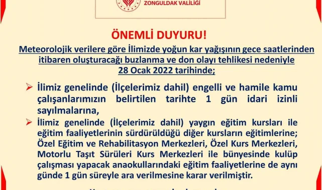 "Meteorolojik verilere göre İlimizde yoğun kar yağışının gece saatlerinden itibaren oluşturacağı buzlanma ve don olayı tehlikesi nedeniyle 28 Ocak 2022 tarihinde, İlimiz genelinde (İlçelerimiz dahil) engelli ve hamile kamu çalışanlarımızın belirtilen tarihte 1 gün idari izinli sayılmalarına, İlimiz genelinde (İlçelerimiz dahil) yaygın eğitim kursları ile eğitim faaliyetlerinin sürdürüldüğü diğer kursların eğitimlerine; Özel Eğitim ve Rehabilitasyon Merkezleri, Özel Kurs Merkezleri, Motorlu Taşıt Sürüleri Kurs Merkezleri ile bünyesinde kulüp çalışması yapacak anaokullarındaki eğitim faaliyetlerine de aynı günde 1 gün süreyle ara verilmesine karar verilmiştir."