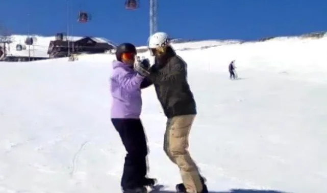 Türkiye'nin en önemli kış turizm merkezlerinden Erciyes Kayak Merkezi'nde kayak yaparak dans eden çift, görenlerin ilgi odağı oldu.
