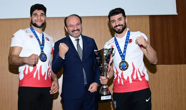 İtalya'da düzenlenen 2021 Dünya Kick Bocks Dünya Şampiyonası Büyükler Kategorisinde 63 Kiloda altın madalya kazanan ETÜ Spor Bilimleri Fakültesi öğretim elemanlarından Arş. Gör. Cebrail Gençoğlu ve aynı şampiyonada 84 kiloda mücadele eden ve turnuvayı Gümüş Madalya ile tamamlayan Spor Bilimleri Fakültesi öğrencilerinden Hakan Koç için hediye töreni düzenlendi.