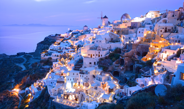 Güneşinin batışıyla ünlü Santorini‘de, mavi beyaz evlerin üzerinde alçalan güneş ve karşınızda diz çöken sevgiliniz… Bir kadın başka ne ister ki?