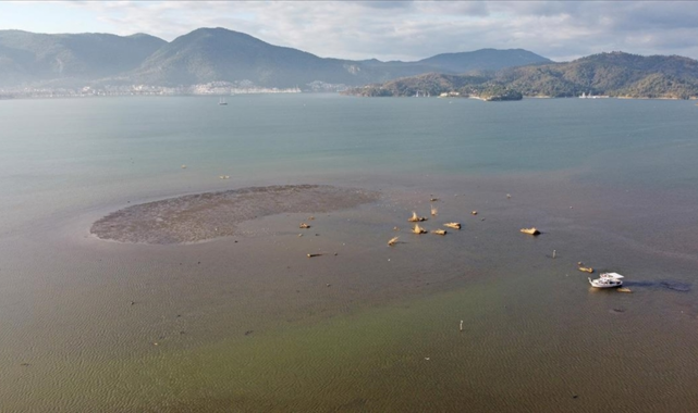 Fethiye Körfezi'nde deniz suyunun çekilmesiyle oluşan görüntü, kordona gezintiye gelenleri şaşırttı. Foça Mahallesi Çalış mevkisinde bölgede yaşayanlar ve ziyaretçiler ortaya çıkan manzaranın fotoğraflarını çekti.