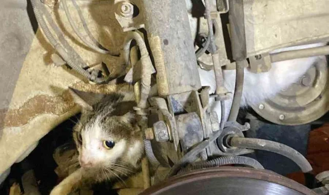 Muğla'nın Fethiye ilçesinde, otomobilin motor bölümüne sıkışan kedi, itfaiye ekiplerinin yarım saatlik çalışmasıyla kurtarıldı.