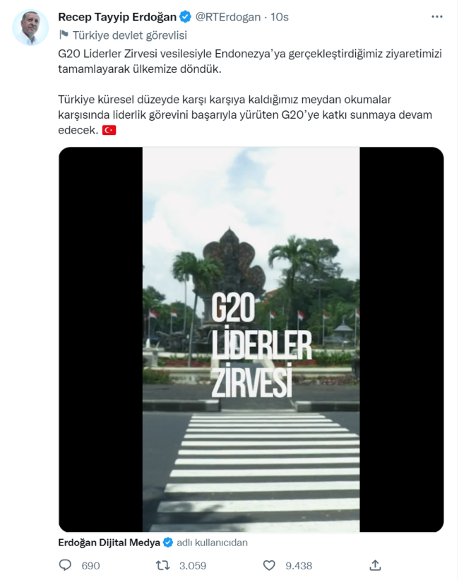 Cumhurbaşkanı Erdoğan, sosyal medya hesabından yaptığı paylaşımda, "G20 Liderler Zirvesi vesilesiyle Endonezya'ya gerçekleştirdiğimiz ziyaretimizi tamamlayarak ülkemize döndük. Türkiye, küresel düzeyde karşı karşıya kaldığımız meydan okumalar karşısında liderlik görevini başarıyla yürüten G20'ye katkı sunmaya devam edecek." ifadelerini kullandı.