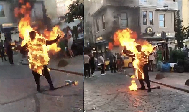 Galata Kulesi Meydanı'nda eline plastik orak alan bir kişi tinerle kendini yaktı. Gencin alev topuna döndüğü o dehşet anları kameralara yansırken, vatandaşların yangın söndürme tüpüyle müdahale ettiği genç ağır yaralı olarak hastaneye kaldırıldı.