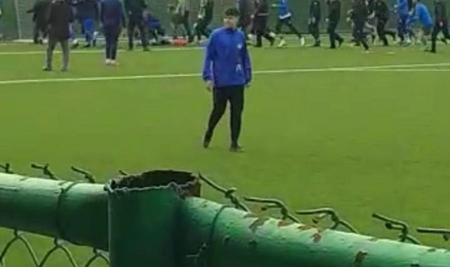 Kavga anı tribünde yer alan bir taraftarın cep telefonu kamerasıyla kaydedildi.