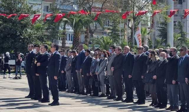 Protokol üyelerinin Atatürk anıtına çelenk sunumuyla başlayan tören, saygı duruşu ve eşliğinde okunan İstiklal Marşı ile devam etti.