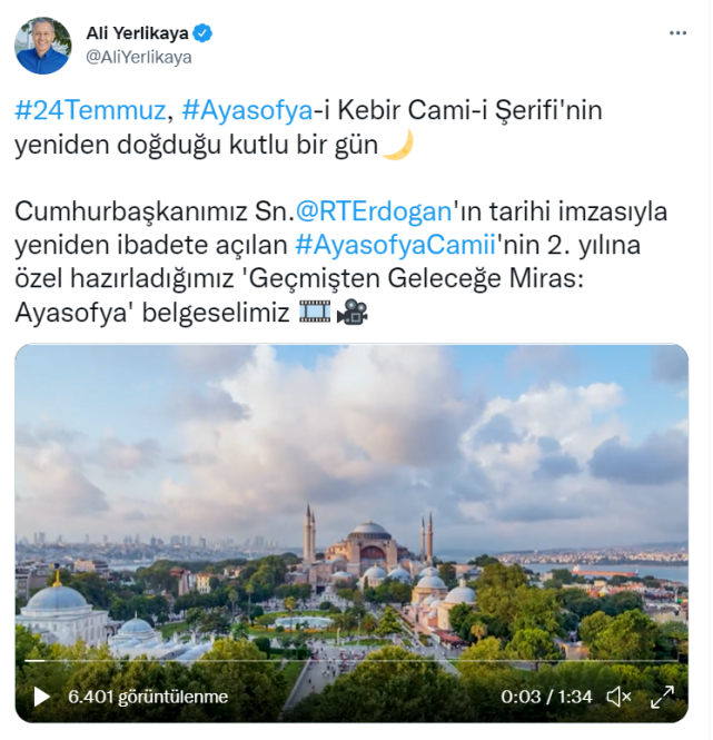İstanbul Valisi Ali Yerlikaya, sosyal medya hesabından yaptığı paylaşımda, "24Temmuz, Ayasofya-i Kebir Cami-i Şerifi'nin yeniden doğduğu kutlu bir gün. Cumhurbaşkanımız Sn. Erdoğan'ın tarihi imzasıyla yeniden ibadete açılan Ayasofya Camii'nin 2. yılına özel hazırladığımız 'Geçmişten Geleceğe Miras: Ayasofya' belgeselimiz" ifadelerini kullandı.
