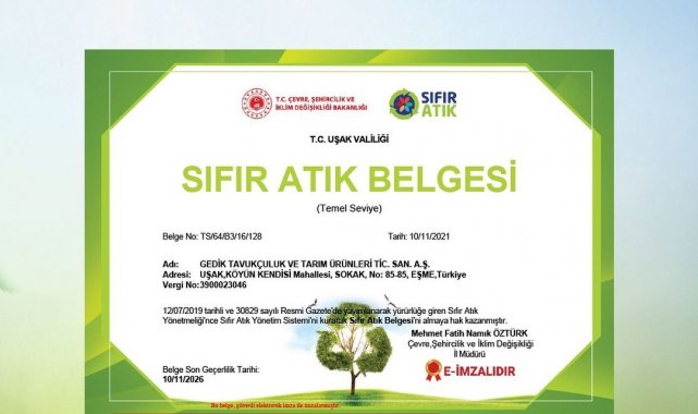 Uşak Valiliği aralığıyla Gedik Piliç'e takdim edilen belgede, "Gedik Tavukçuluk ve Tarım Ürünleri Tic. San. A.Ş; 12 Temmuz 2019 tarihli ve 30829 sayılı Resmi Gazete'de yayımlanarak yürürlüğe giren Sıfır Atık Yönetmeliğince 'Sıfır Artık Yönetim Sistemi'ni kurarak 'Sıfır Atık' belgesini almaya hak kazanmıştır" ifadelerine yer verildi.