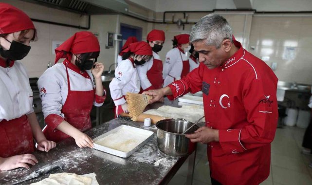 Bir baklava firması ile tamamı kız öğrencilerin eğitim gördüğü okul arasında yapılan protokol çerçevesinde kadın baklava ustalarının sayısının arttırılması hedefleniyor. 10'uncu sınıf öğrencileri, uygulamalı eğitim aldıkları sınıfta baklava ustaları İmdat Tekin ve Arif Aslan tarafından baklavanın püf noktalarını öğrendiler.