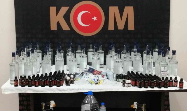 Çalışmalar sonucunda 8 litre el yapımı açık içki, 45 litre etil alkol, 764 adet içki yapımında kullanılan aroma, aroma kiti ve alkol yapımında kullanılan malzeme ve 840 dal içi tütün ile doldurulmuş makaron ele geçirildi.