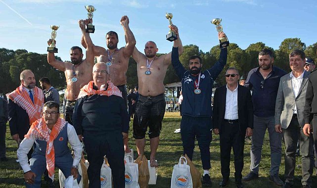 Başpehlivanlığı kazanan Recep Kara ile Fatih Atlı ile Ertuğrul Dağdelen'e ödüllerini Gömeç Belediye Başkanı Mehmet İrem Himam ile Balıkesir Büyükşehir Belediye Başkan Vekili Birol Şahin takdim etti.
