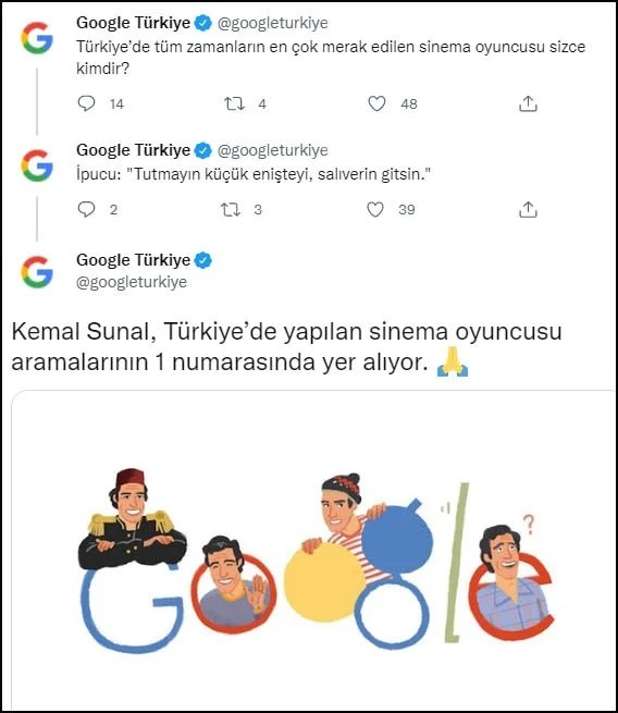 Verilere göre 2000’de ölen ve bugün 7’den 70’e herkesin severek izlemeye devam ettiği usta sanatçı Kemal Sunal, Türkiye’nin bugüne kadar Google’da en çok aradığı sinema oyuncusu.