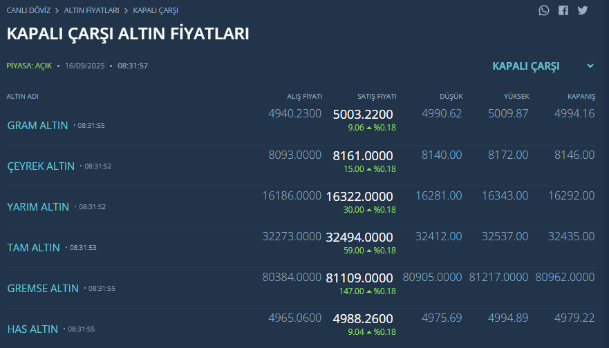Kapalıçarşı altın fiyatları ile resmi altın fiyatları arasındaki fark devam ediyor. Resmi rakamlarda 4 bin 892 lira olan gram altın, Kapalıçarşı altın 5 bin lira oldu. İşte Kapalıçarşı altın fiyatları...