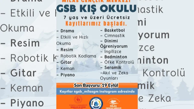 Milas Gençlik Merkezi olarak, Halk Eğitim Merkezi Müdürlüğü ile ortaklaşa düzenlediğimiz GSB Kış Okulları'nın kayıtları başladı! 19 Eylül'e kadar devam edecek olan başvurularla, 7 yaş ve üzeri herkes birbirinden farklı ve ücretsiz kurslardan faydalanabilecek.