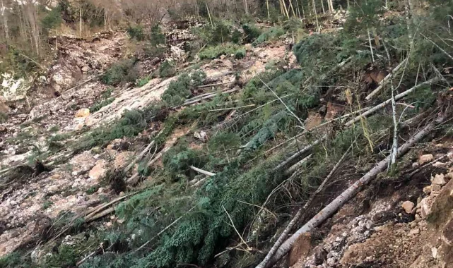 Kastamonu'nun Pınarbaşı ilçesinde meydana gelen heyelan sebebiyle çok sayıda ağaç devrildi.