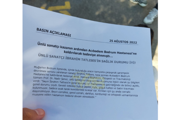 Bu gün sabah saatlerinde Yalıkavak-Bodrum istikametinde kaza yapan ünlü sanatçının sağlık durumu ile ilgili basın açıklaması geldi. Ayağında kırıklar bulunan ünlü sanatçı için cerrahi operasyon yapılmayacağını söyleyen doktorlar tedavisinin devam ettiğini söyledi. Basın açıklamasının tamamı haberimizde.