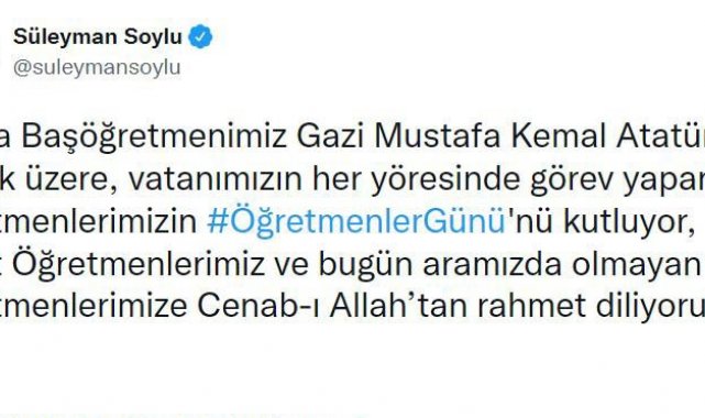 Öğretmenlerin millete rehber olmaya devam edeceğini belirten Soylu, başta Mustafa Kemal Atatürk'ün öğretmenler gününü kutlayarak şu ifadeleri kullandı: